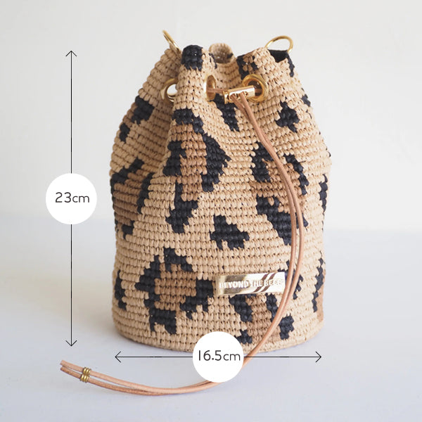 超豪華にグルっと一周レオパード柄で編み上げた巾着バッグ。