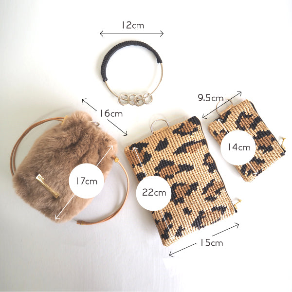 その横には、スマホやちょっとした小物が入るファー巾着を添えた3点セットです。